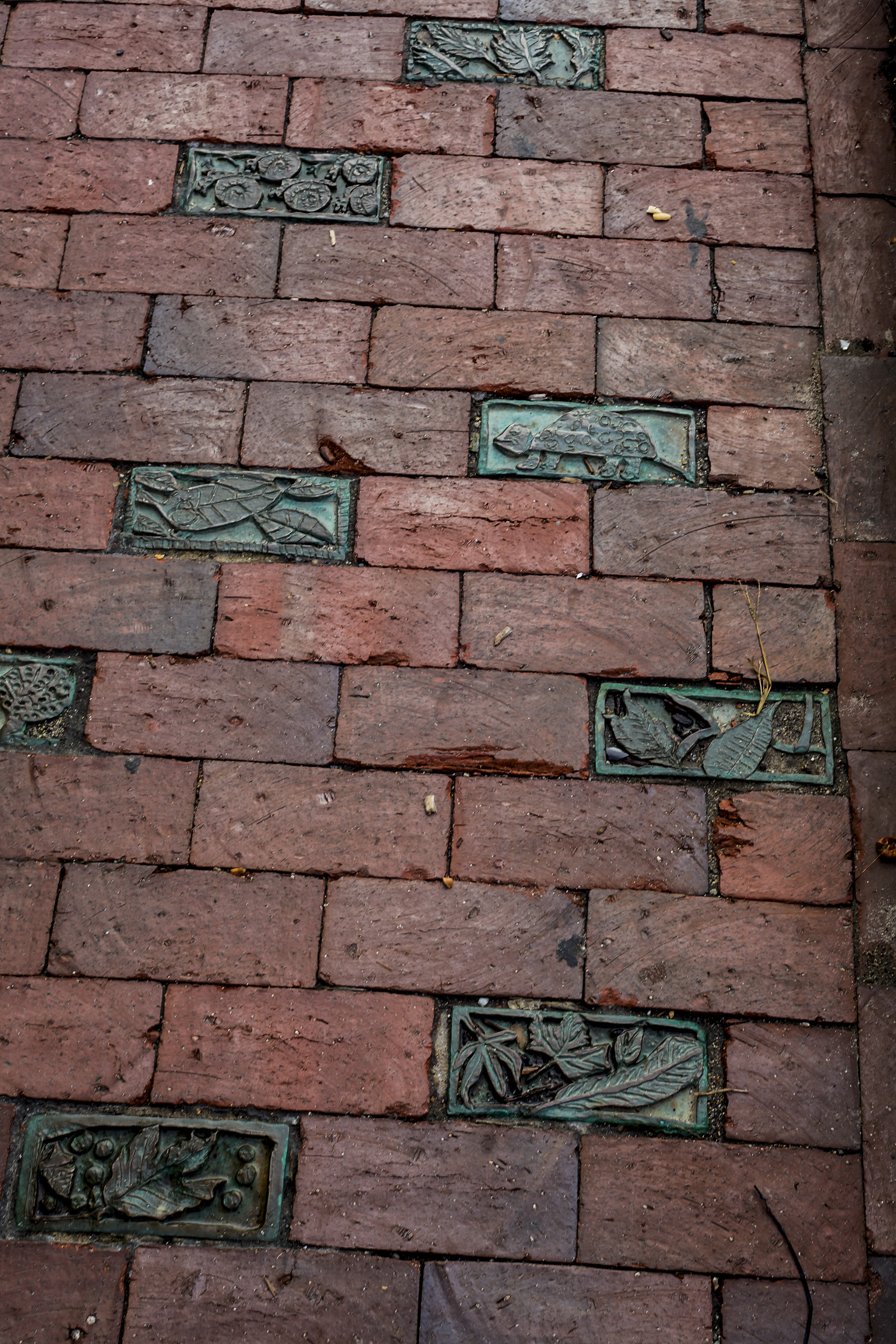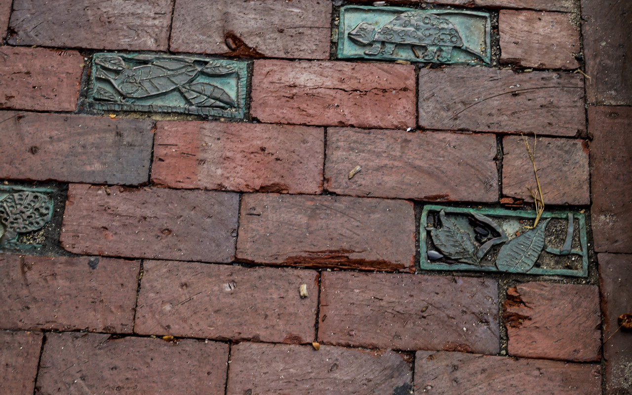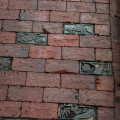 Artist Natasha Mayers worked with children at the Reiche School, teens in a hip-hop group at The Center for Cultural Exchange; members of the Portland Coalition and Amistad Center, staff and clients of Portland West, and even some City Council members to make one hundred and twenty five clay tiles. Patrick O’Brien, a student at MECA, under the guidance of teacher Anthony Tafuri, then cast them in bronze. The City’s Public Works Department installed the bronze tiles in the Longfellow Square sidewalks in October 2006.