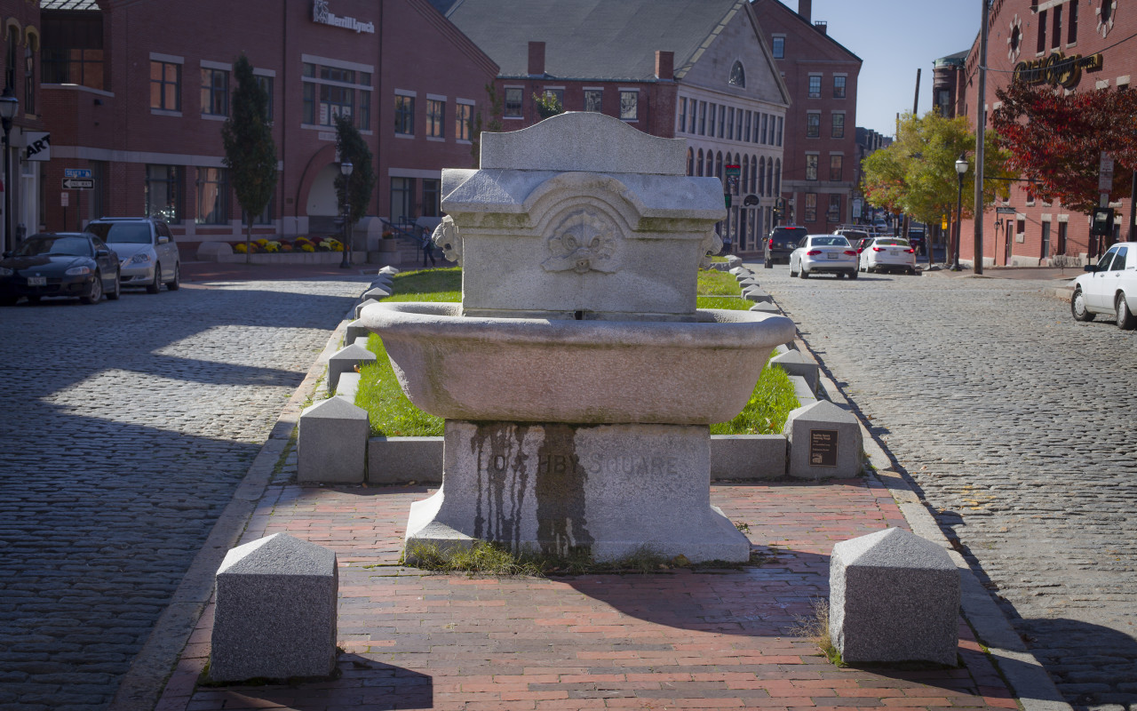 The watering trough now has a small protective island, and is guarded by short granite posts to help prevent any future traffic mishaps. Very little re-plumbing was necessary as the original piping was mostly intact when the trough was returned to its place at the end of Fore Street. It is a working trough with two levels, one for horses and another for dogs. A simpler flattened stone has replaced the granite dome-like piece that once stood on top but otherwise it has been restored to its original state and re-entered into the Portland Public Art collection in June 2005.