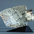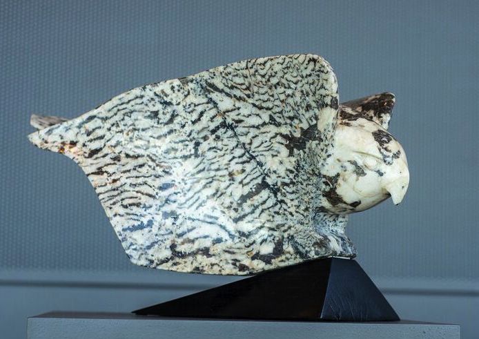 Gyre Falcon is carved from a piece of Feldspar known as “graphic granite” for its wonderful patterning. Von Huene found this particular piece in a quarry in Georgetown, Maine. It is an interesting material to work due to the patterns, sub-patterns, and the types of shapes that the raw material takes. The material is a combination of medium-hard feldspar and hard quartz.