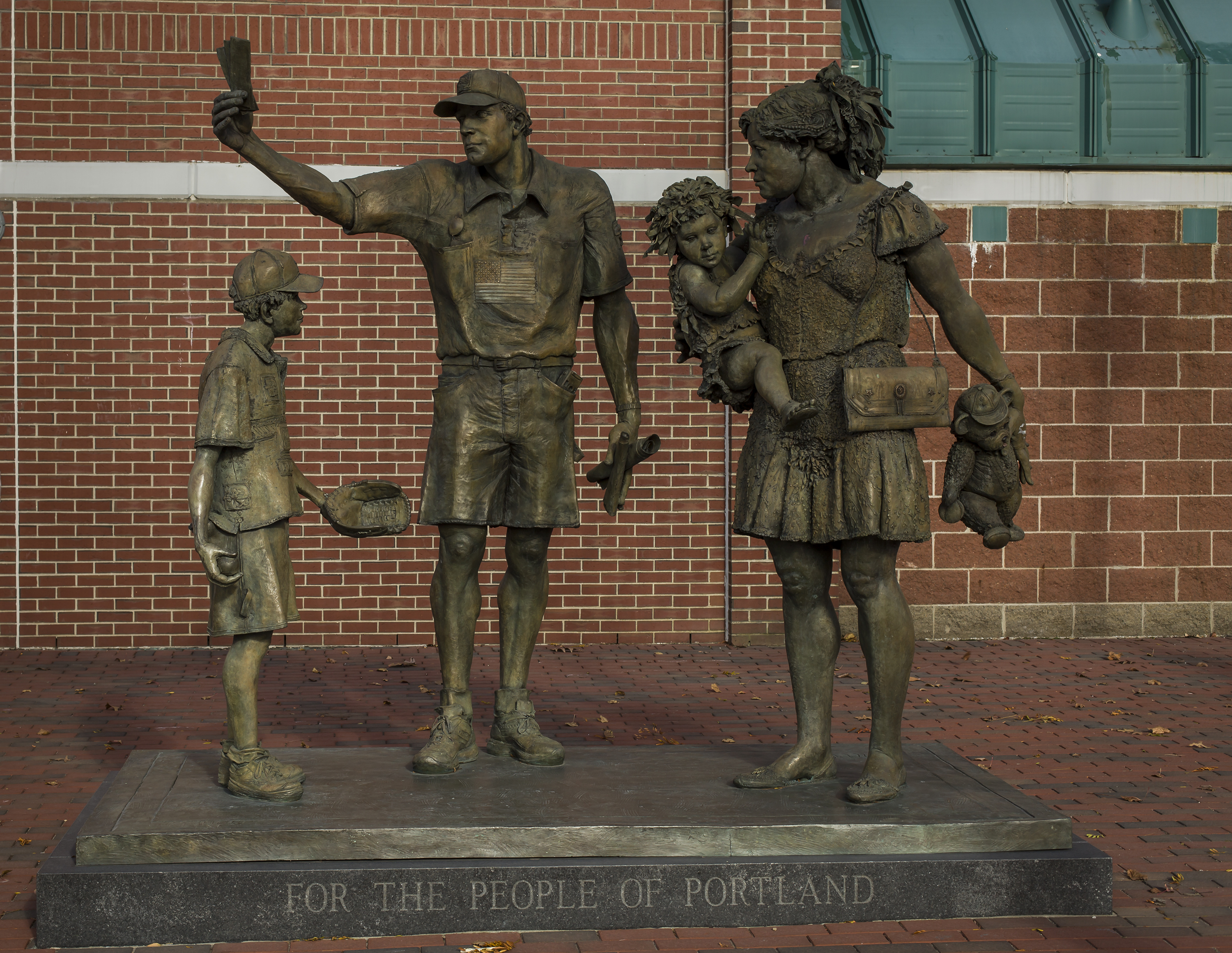 The Hadlock Field Family sculpture was a gift from Daniel Burke, owner of the Portland Sea Dogs, and his wife, Bunny. They commissioned artist Rhoda Sherbell to create a sculpture that depicted a family going to a baseball game.