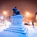 The cast-bronze Henry Wadsworth Longfellow Statue was commissioned to memorialize Portland’s native son and America’s most famous and beloved 19th century poet. Portland-born sculptor Franklin Simmons, one of the nineteenth century’s leading sculptors, created it in his Rome, Italy studio and it was dedicated September 29, 1888.  The sculpture is a portrait of a bearded Longfellow, seated with his right arm resting on the back of his chair, holding a scroll in his lap with his left hand. Three bronze books are placed under his chair. He is seated casually facing the city center and when the holiday season approaches, Longfellow is inevitably found holding a wrapped present.