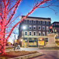 The Square itself is surrounded by 19th century buildings, most of which were built as homes before being converted to commercial use by the 1920’s. Originally, State Street passed on both sides of the statue. In the 1970’s, a landscaped pedestrian area on the east side of the statue was created, and traffic restricted to the west side. In 2005 the square was redesigned to create additional pedestrian space and landscaping.
