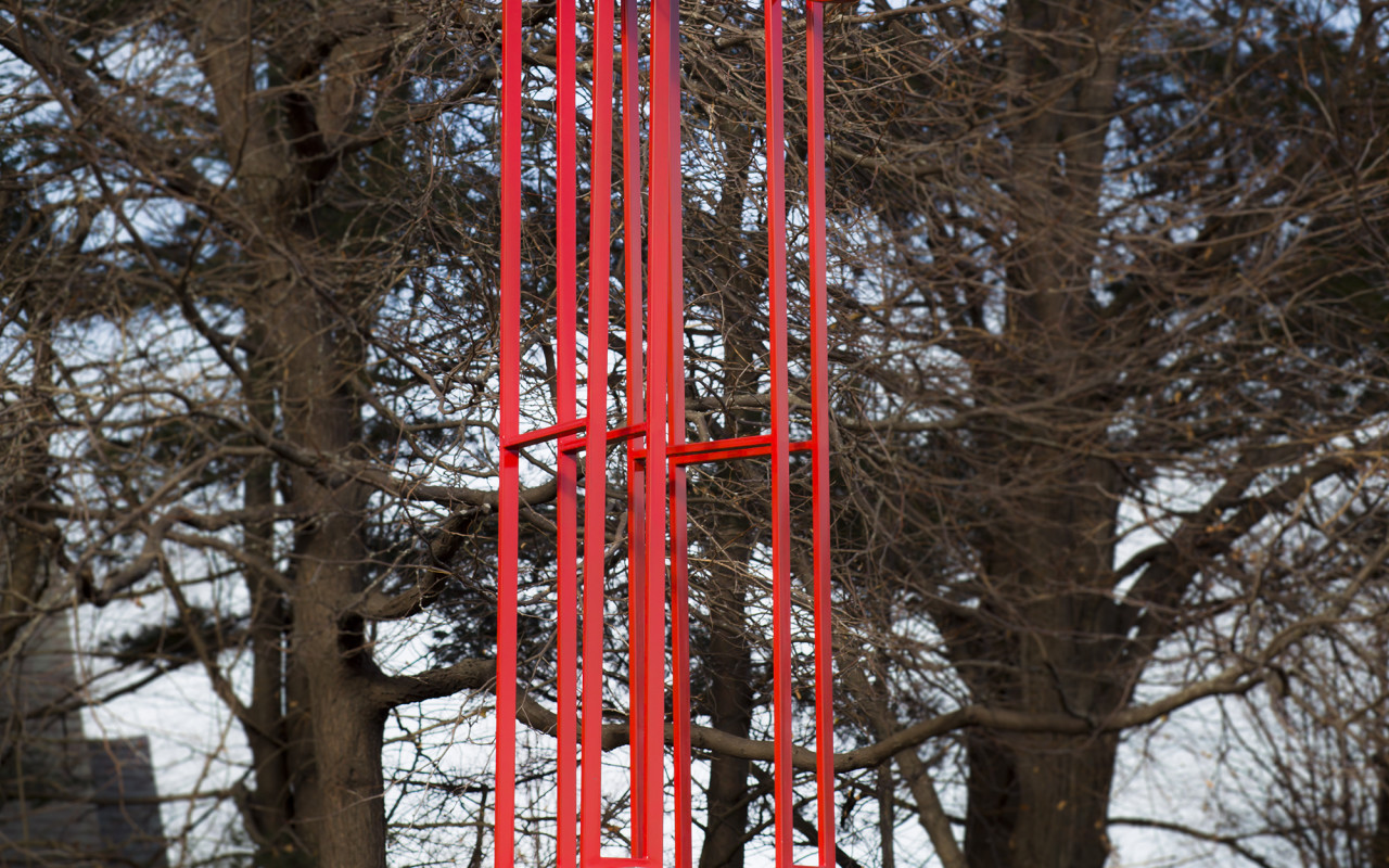 Rustle Diptych II, a vertical, red-painted steel sculpture by Maine College of Art (MECA) graduate Vivien Beer, is sited in Winslow Park, at the corner of Baxter Boulevard and Temple Street. Rustle Diptych II was designed to conjure the idea of “a sail caught in the wind, a wisp of smoke and an ironic throne.” Beer also contributed Cloud Couch as a companion piece for Rustle Diptych II.