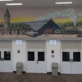 Don Thayer painted the mural depicting Union Station and Libbytown in a little over six weeks in 1979 using acrylic paint and acrylic sealer. Thayer laid out a grid on the wall and used charcoal to sketch each section of this mural. Thayer graduated with a BFA cum laude from Syracuse University. He worked as an illustrator for McGraw-Hill and Ziff- Davis. Thayer taught at the Portland School of Art, which would later become MECA (Maine College of Art), and he lived with his family in Farmington.