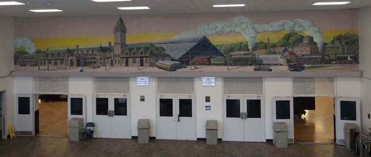 Maine artist, Don Thayer, painted the mural on the wall above the doors leading into the Portland Expo auditorium in 1979. It depicts nearby Union Station, which stood from 1888 to 1961 on St. John Street on the site of the shopping plaza where Buckdancer’s Choice and Maine Hardware are now located.