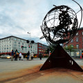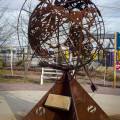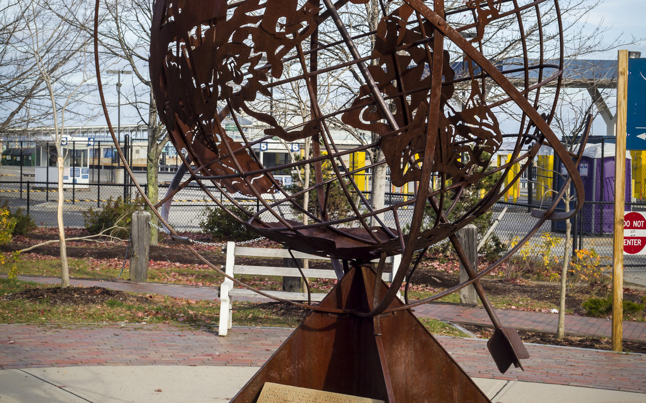 The original plan was for a large compass embedded in the concrete walkway. The plan evolved and support developed for a sculpture to better mark the beginning of the trail, something more visible. Plourde proposed a 10’ armillary, and after several meetings with the advisory committee decided on a globe design of the continents. A rod passes through the sphere that casts shadows and acts as a sundial.