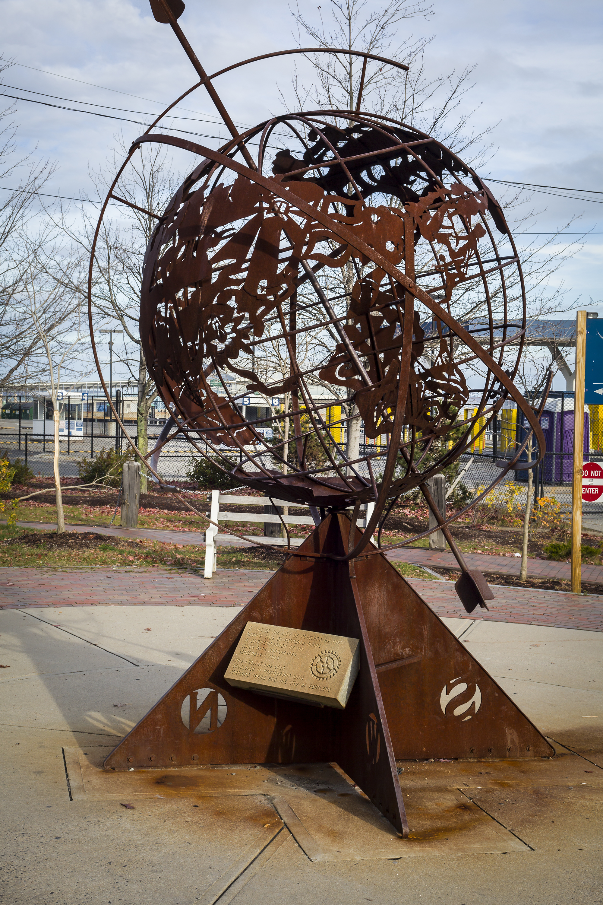 Untitled-Armillary is a sculpture made by Maine metal sculptor, Patrick Plourde. Casco Bay Sunrise Rotary Club headed up the financial donors of a $10,000 grant to honor Portland Trails with a compass-like monument. Portland Trails donated the piece to the City in 1999.